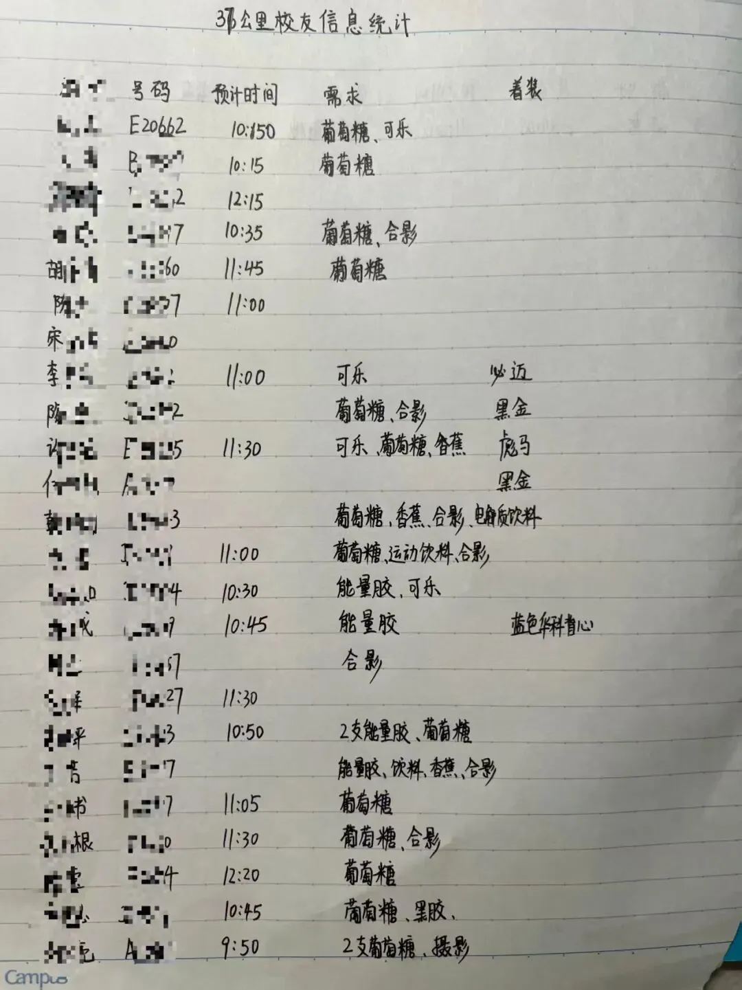 △37km志愿者胡芬手写汉马健儿参赛需求,精准补给