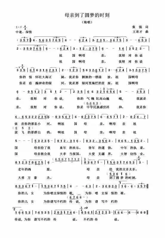 祖国啊母亲 我想对您说 您的情怀比大海还辽阔 我是您拥抱的一缕清波 祖国啊母亲 我想对您说 您的气质比高山还巍峨 我是依恋您的那条小河 祖国母亲 啊--祖国 母亲给了我 童年的欢乐 青年的蓬勃 中年的执着 老年的洒脱 母亲给我的太多太多 您的儿女为您唱支感恩的歌 祖国啊母亲 我想对您说 您是那浩瀚神奇的银河 我是银河里繁星一颗 祖国啊母亲 我想对您说 您是中华民族盛世祥和 我是您放飞的那只白鸽 祖国母亲 啊--祖国 母亲教会我 大孝当报国 大爱无疆界 大智创伟业 大勇方豪杰 母亲到了园梦的时刻 您的儿女为您谱写不朽的传说 您的儿女为您谱写不朽的传说 ——···——···——··· 歌曲《母亲到了园梦的时刻》 作词:张 强 作曲:王连才 演唱:龚天卓 (男, 声乐博士,首都师范大学教授) 演唱:王玉景 (女, 声乐硕士,聊城一中)