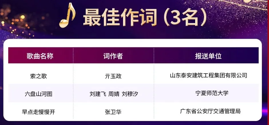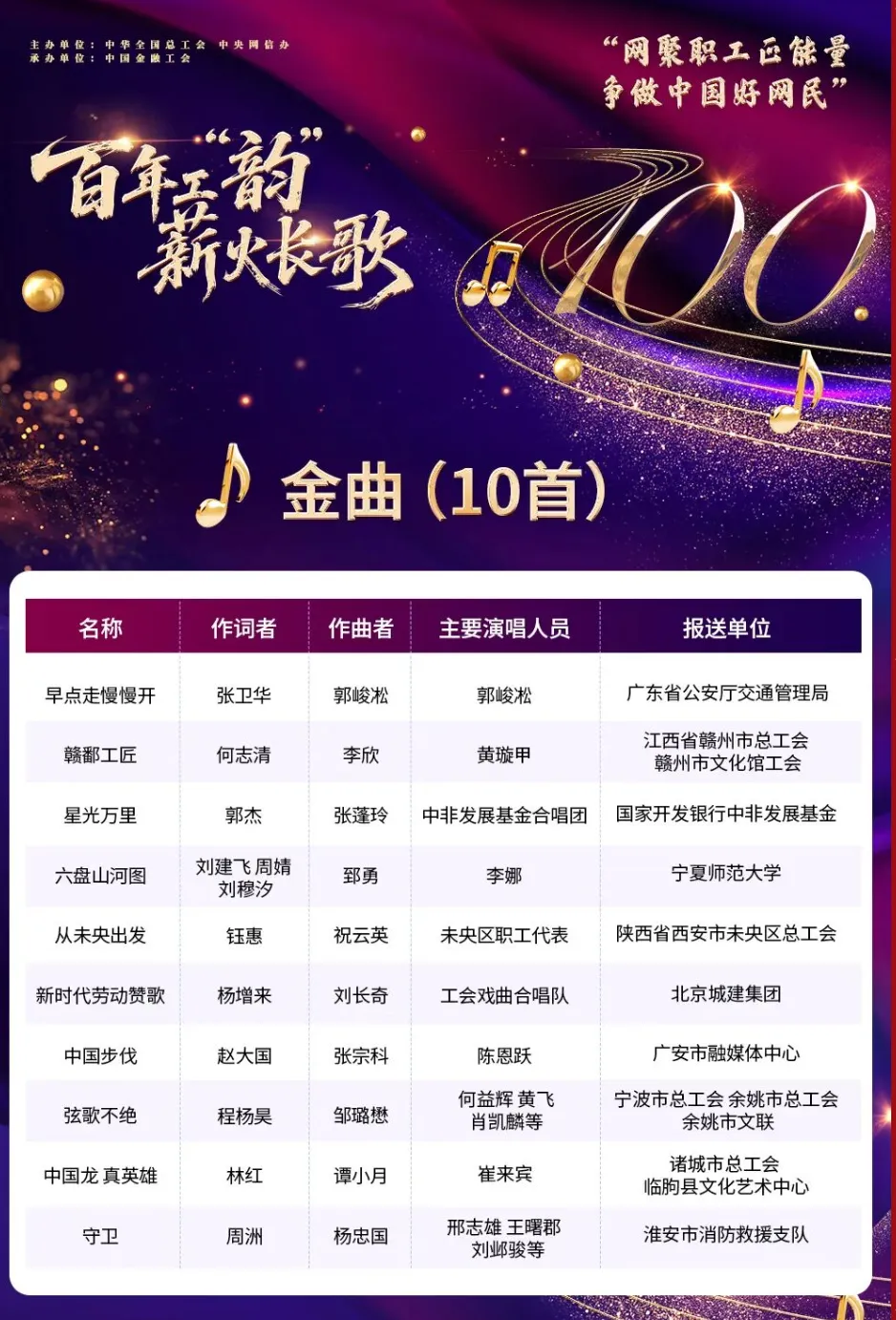 今日,由广东省公安厅交通管理局组织创作的交通安全歌曲《早点走 慢慢开》,在全国总工会、中央网信办主办的 2025年度“网聚职工正能量 争做中国好网民” 主题活动中,被评为十大金曲,位列榜首!并获“最佳作词”。