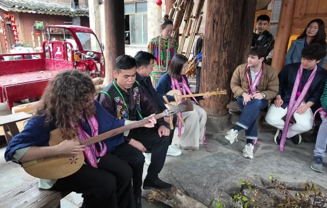在侗寨参观环节,耶鲁学子们走进文化展示中心,了解侗族历史文化脉络;在侗品源体验蜡染技艺,亲手触摸非遗的温度;在火塘边,与侗族乐器制作非遗代表性传承人交流琵琶技艺。鼓楼间,他们与侗族群众一起打糍粑、听《四季劳动歌》,在劳动号子中感受侗家人与土地的情感联结。