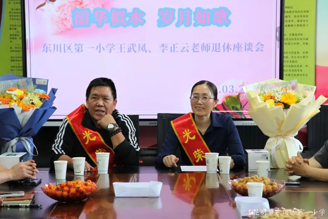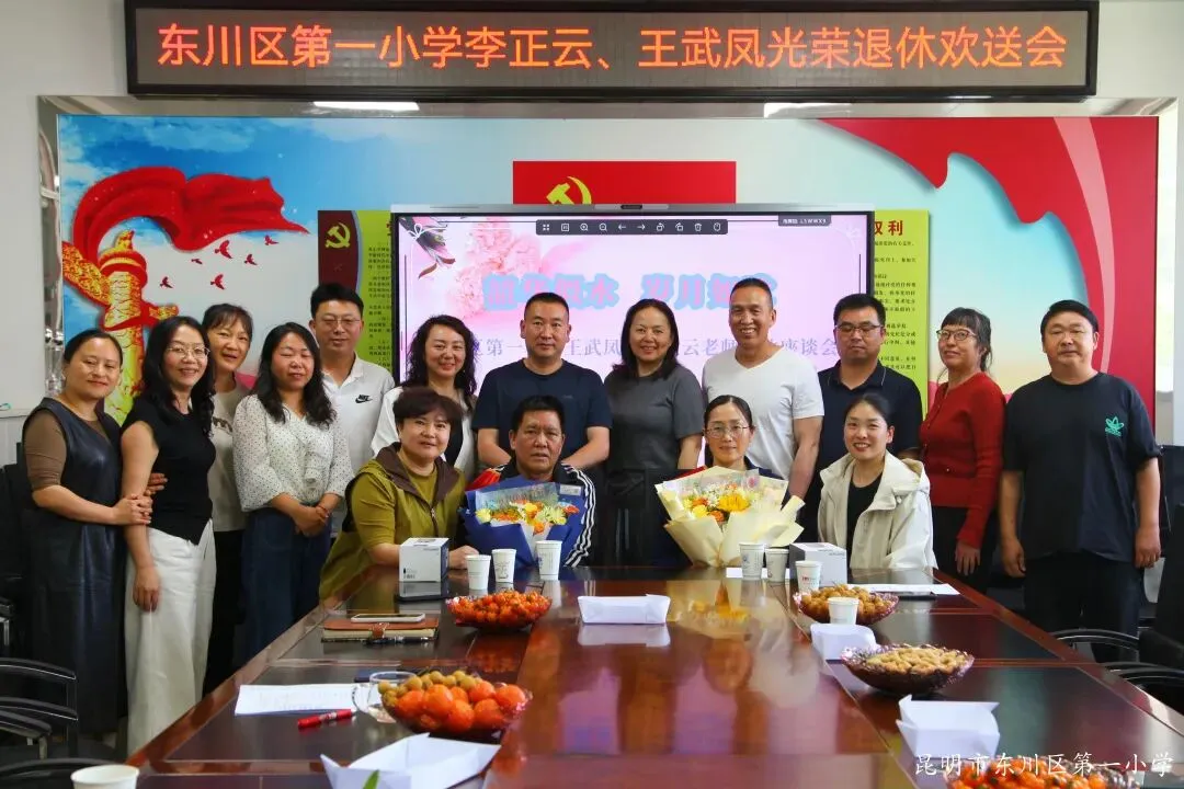 2026年3月24日下午,东川区第一小学党总支委员、工会委员、以及教导处、办公室、年级组的老师们欢聚一堂,为王武凤、李正云两位老师举行光荣退休欢送会。