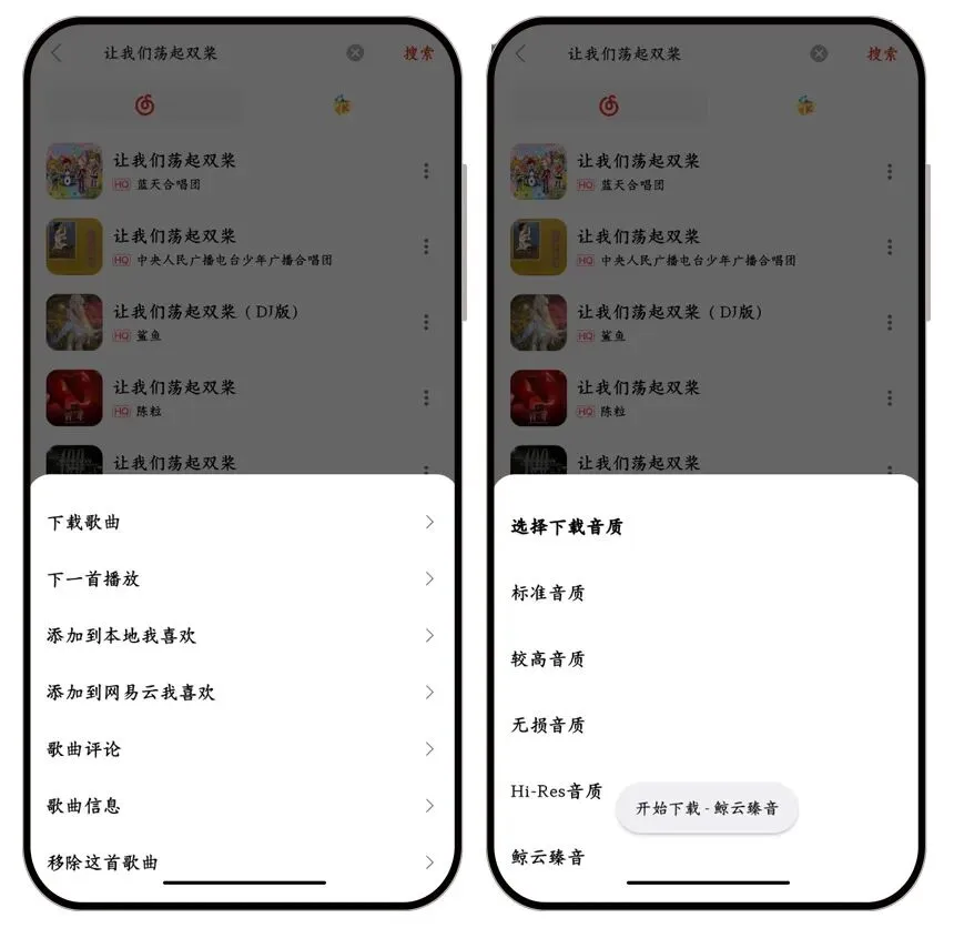 如果想要把歌曲下载到手机上保存,只需在搜索列表点击右侧三个点,然后点击下载歌曲,选择你需要下载的歌曲音质即可。