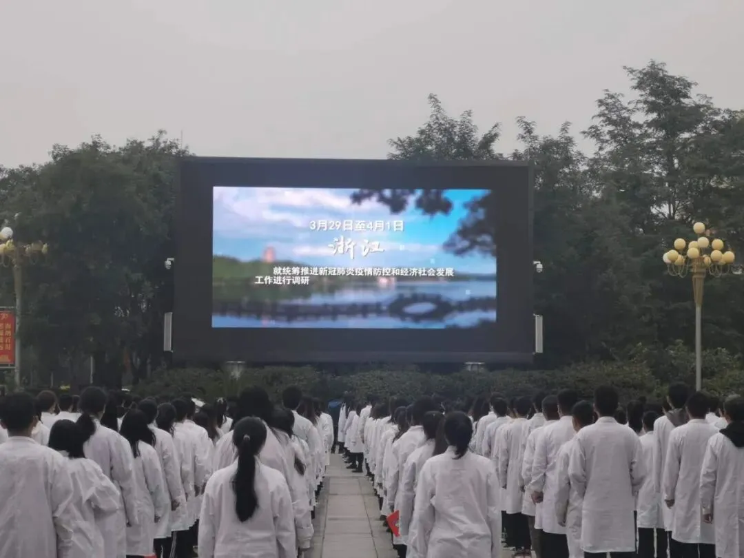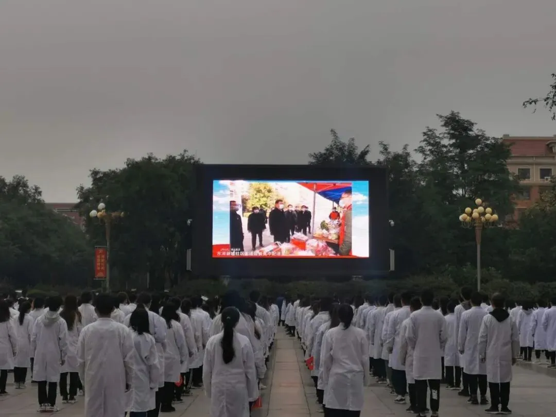 我们的祖国经历了71年的风风雨雨,形成了伟大的抗战精神,在此次疫情期间我们国家涌现出一批又一批爱国之士,在自己的岗位上默默坚守,为国家的疫情转好做出了巨大的贡献,让我们跟随习近平总书记的脚步、一起聆听、学习、见证祖国的强大。全体师生齐看大屏幕。