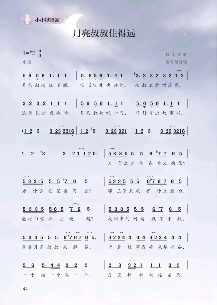 《月亮叔叔住得远》源自印度经典童谣《Chanda Mama Door Ke》,原曲以 “月亮舅舅” 为形象,主题温馨童趣,核心是长辈与孩子的温情互动。