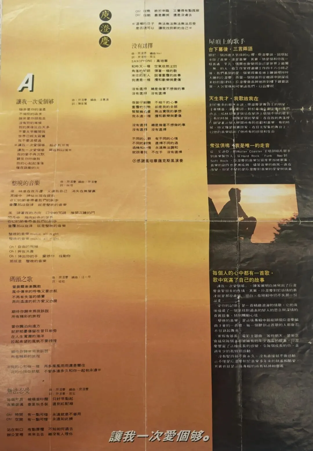 1986年12月,庾澄庆推出首张专辑《伤心歌手》。这张专辑由他作曲、编曲、演唱、制作,他也成为台湾乐坛第一个这样做的歌手。销量10万张,对于新人来说已是亮眼成绩。1988年,《错过的爱》专辑中的《想念你》让他开始获得关注。这首歌是为纪念刚刚过世的父亲而写,在他嘻哈的表象之下,藏着忧伤的底色。1989年是转折之年。7月,《让我一次爱个够》专辑横空出世,销量40万张。同名主打歌经张学友翻唱成粤语版《只愿一生爱一人》,成为香港年度十大劲歌金曲。陈乐融称这张专辑是西式乐风对台湾歌坛“体制内革命”的成功。1990年,他在台北、台中、高雄举行户外个人演唱会,成为台湾第一位举行个人户外演唱会的歌手。同年获得香港十大中文金曲最有前途新人奖。第三章:华人音乐的先驱