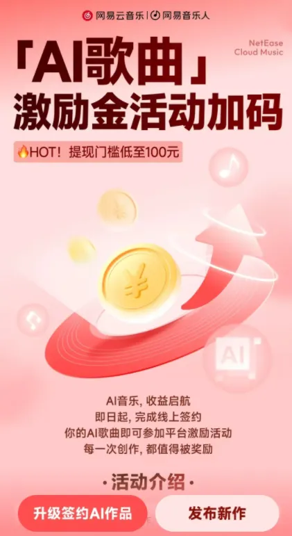 门槛低,不需要你是专业音乐人,也不需要先认证网易音乐人,小白也能操作。把一键生成的ai歌曲直接上传就可以、秒通过,有播放就有收益,而且是持续性的。已经有人通过堆积歌曲数量而获得了不错的收益。
