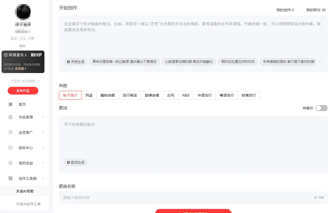 免费生成ai歌曲的平台也有很多:网易自带的天音ai写歌、抖音音乐的创作实验室、以及被用的最多的suno平台等等。