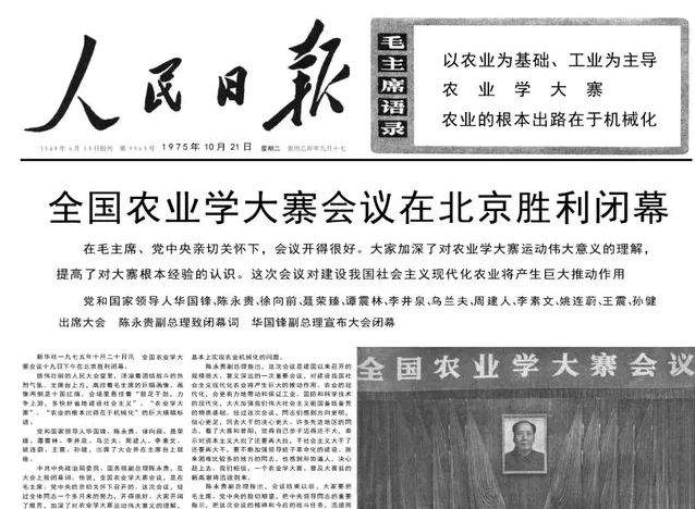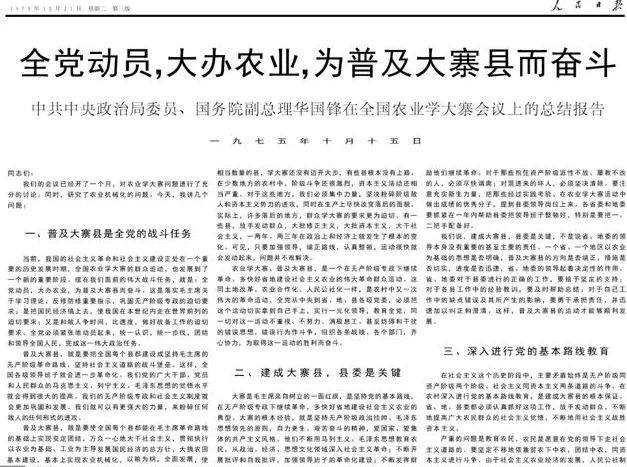 李克勤(jixuie)题记:1975年召开的全国农业学大寨会议上,华国锋作了总结报告,题目是《全党动员,大办农业,为普及大寨县而奋斗》,这以后“普及大寨县”,在随后几年里,的确是全国性的一项声势浩大的系统工程。