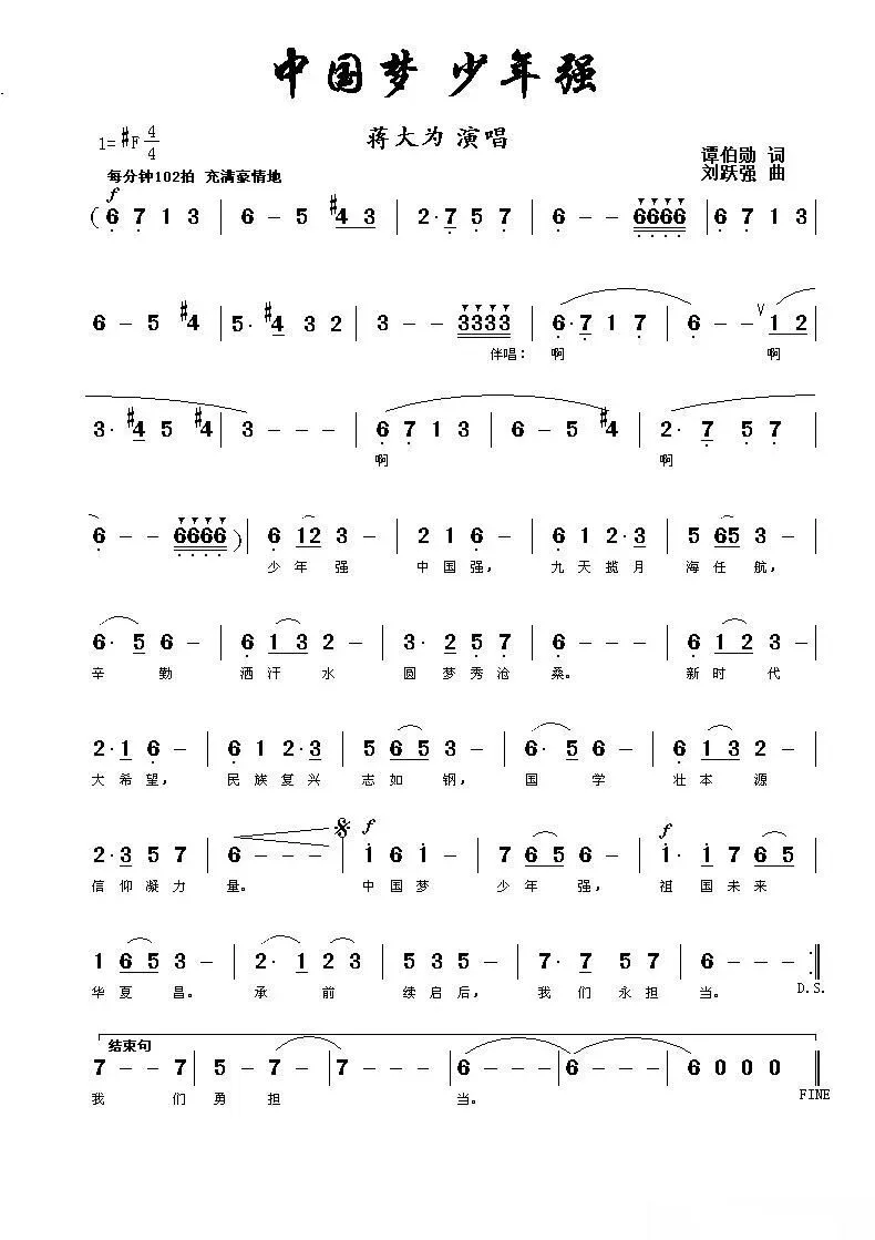 《中国梦少年强》是由谭伯勋作词、刘跃强作曲、蒋大为演唱的一首正能量励志歌曲。创作于2015年,以“少年强则中国强”的核心理念,呼应的“中国梦”主题。这首歌旨在激发中国当代青少年的爱国情怀与责任担当,歌词凝练有力,旋律大气磅礴,表达了少年立志报国、勇于担当的时代精神。下面请聆听蒋大为激情澎湃的演唱。