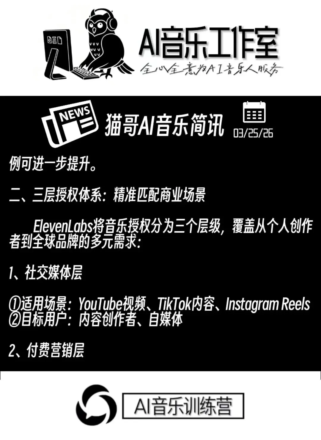 ElevenLabs将音乐授权分为三个层级,覆盖从个人创作者到全球品牌的多元需求: