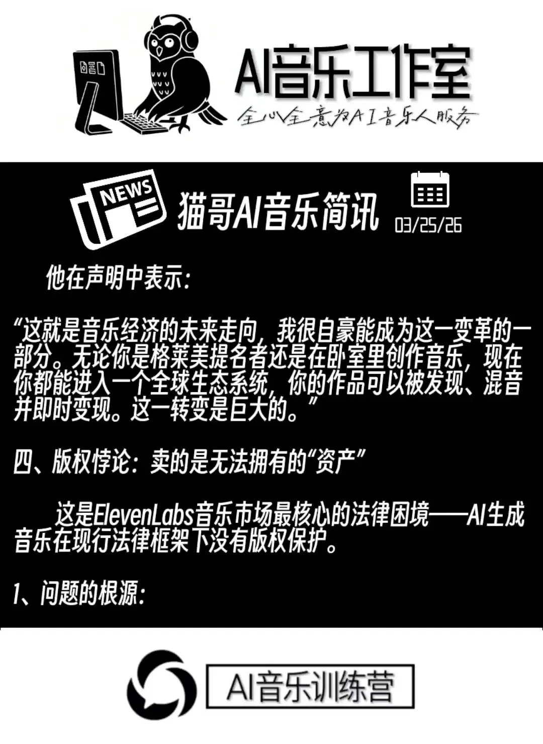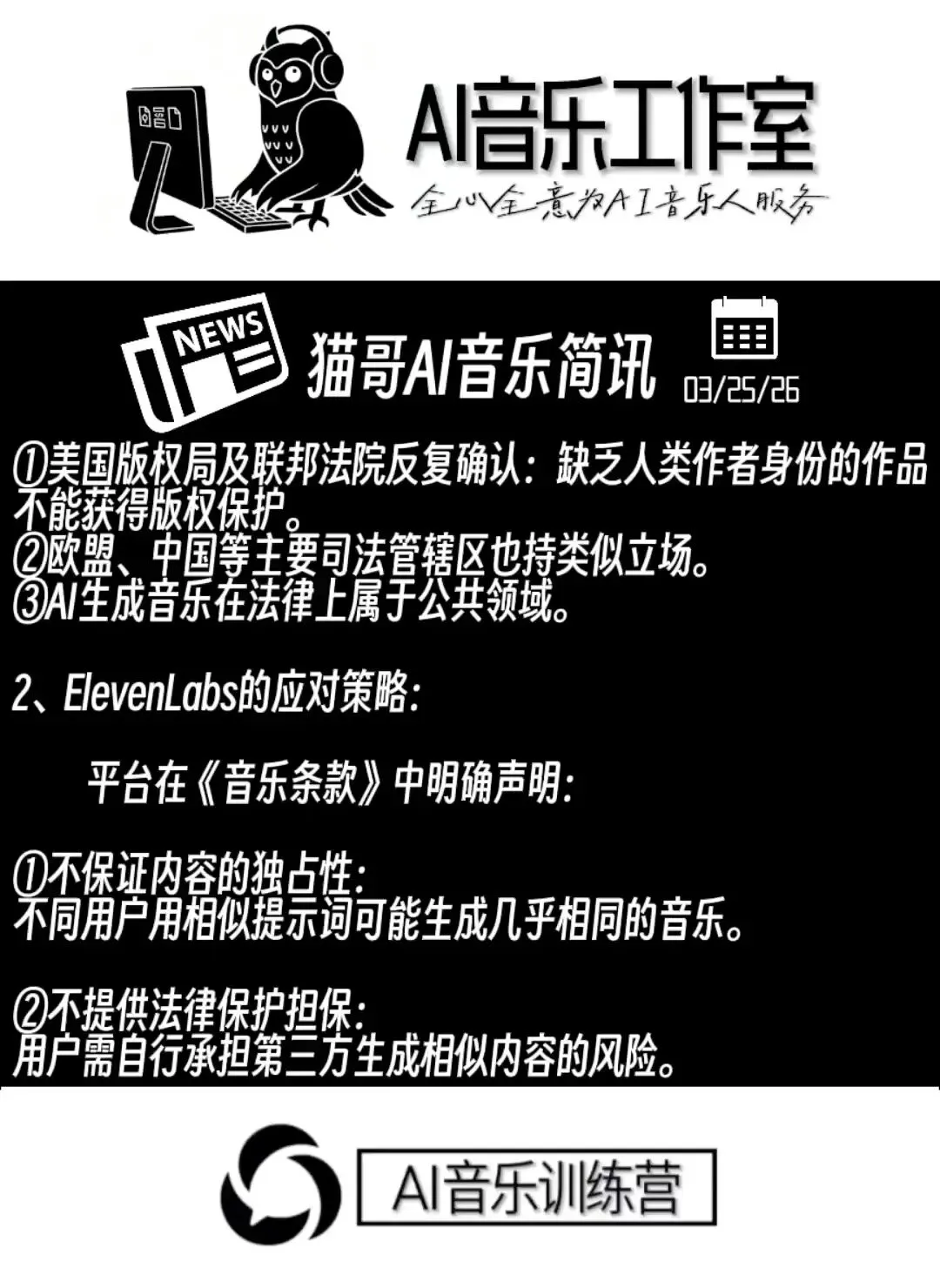 这是ElevenLabs音乐市场最核心的法律困境——AI生成音乐在现行法律框架下没有版权保护。