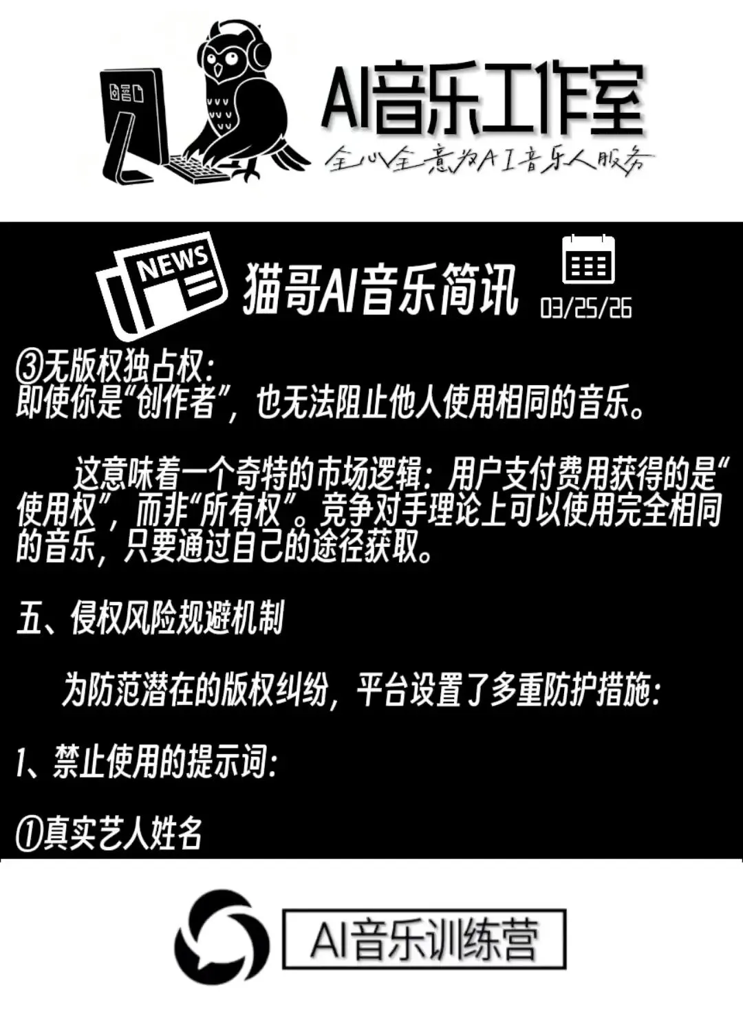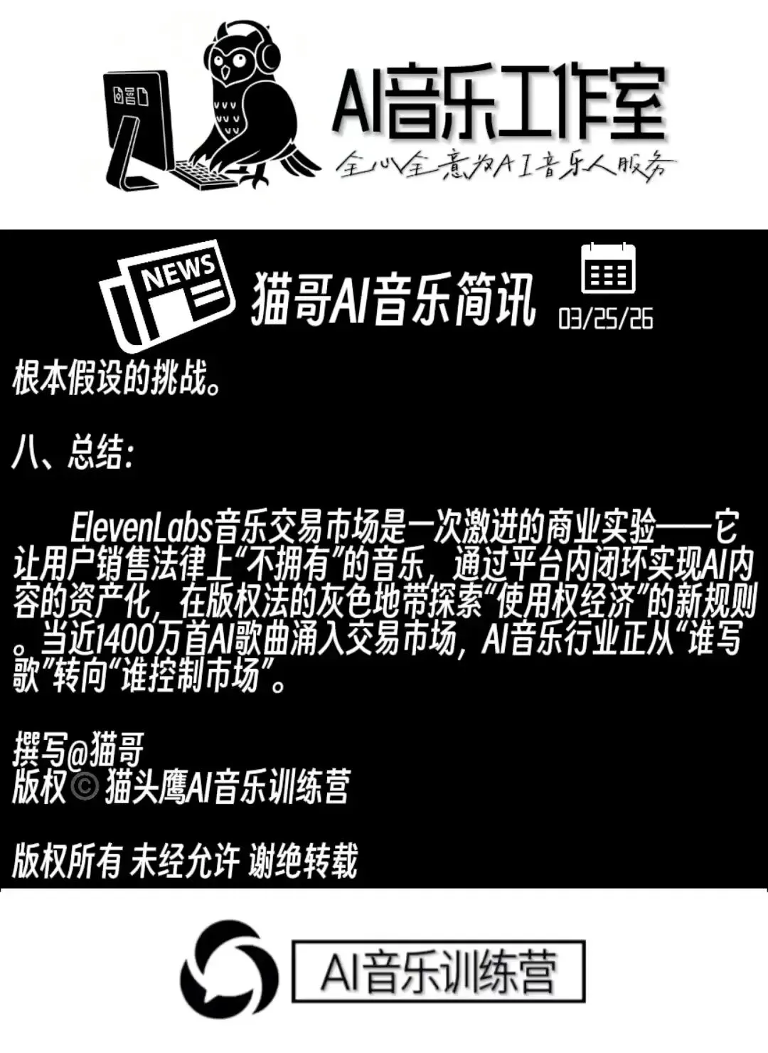 平台条款中明确创作者获得的“财务回报”将取代任何传统表演权或机械版税。这意味着音乐正从受保护的“知识产权”变为可交易的“服务商品”。