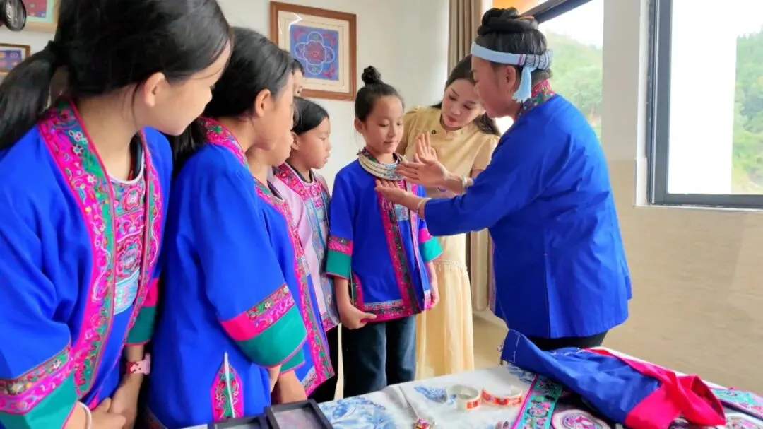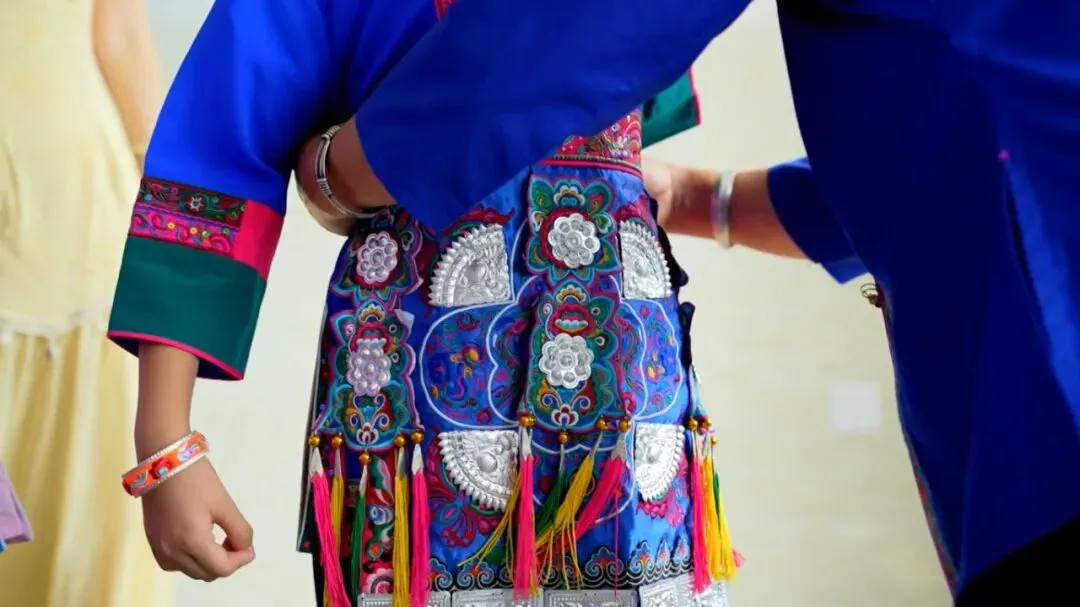 孩子们轻轻抚摸着衣襟上的绣片,每一条纹路都诉说着民族的故事。百褶裙转动时,仿佛翻开了穿在身上的“史书”;银饰碰撞的清脆声响,如同文化血脉的延续。