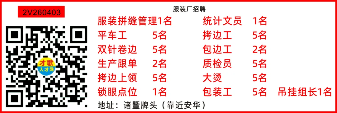 招 聘本公司以自产自销为主,因生产需要,特向社会招聘服装人才,具体如下:专业拷边上v腰 2名 6500—12000拷 边 10名 6500—12000平 车 2名 6500—12000包 边 2名6500—12000套 结 1名6500—11000背心拷边光边 2名 6500-12000本厂做有缝和无缝工资发放准时好结账,长期工外住补贴300地址:东阳市江北街道北鹿西街208号进大门左转走到头电梯上6楼微信同号