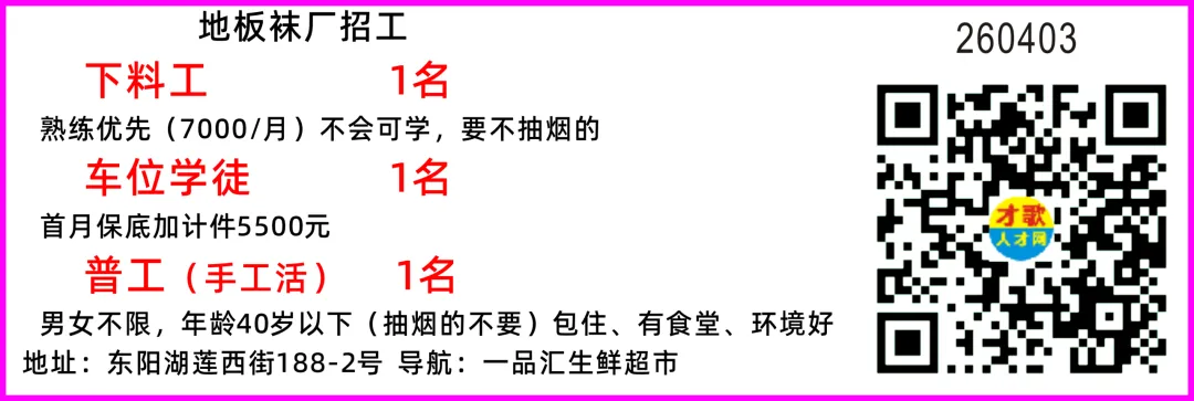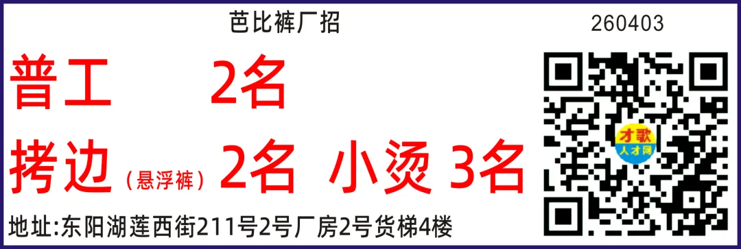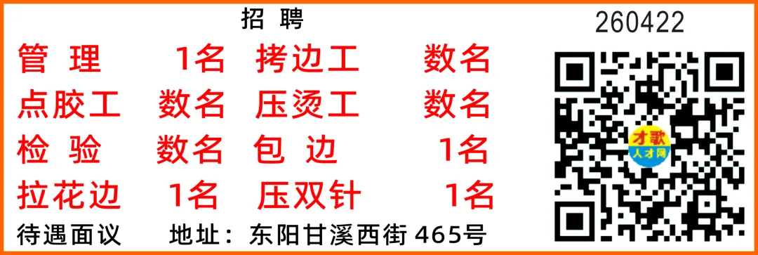 招聘拷边 5名平车 2名地址:东阳江北街道西楼综合楼