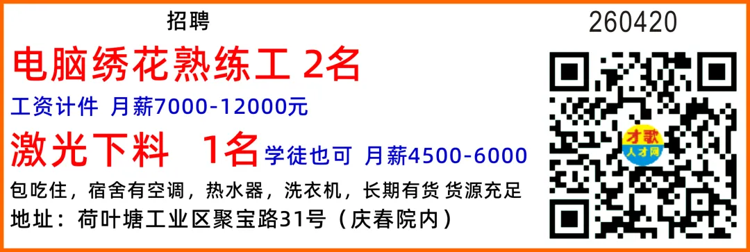 招 聘剪线头 1名工资5000,包吃包住电脑绣花工熟练工数名(能长期做的学徒也可以)包吃包住,工资计件6000-10000元宿舍有空调,热水器,环境优美地址:荷叶塘物华路68号一栋A电梯上去四楼