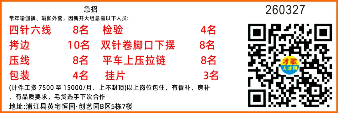 急招常年瑜伽裤、瑜伽外套,因新开大组急需以下人员:吊挂组长 2名文胸组长 2名检验 6名四针六线(高手单切)4名平车上拉链 6名拷边 10名压线 4名(计件工资 7500 至 15000/月、上不封顶)以上岗位包住、有餐补、房补有品质要求,毛货选手下次合作地址:浦江县黄宅恒固·创艺园B区5栋7楼