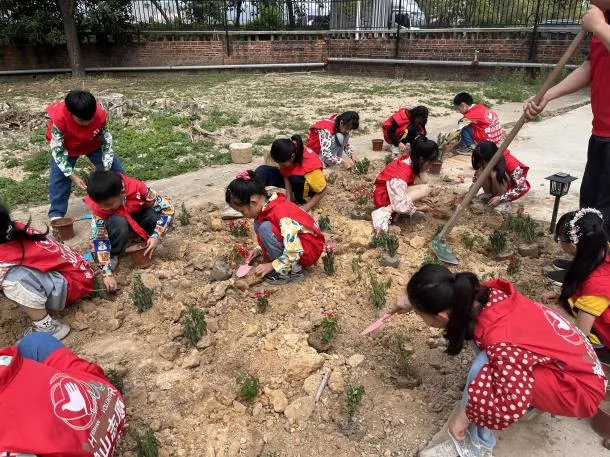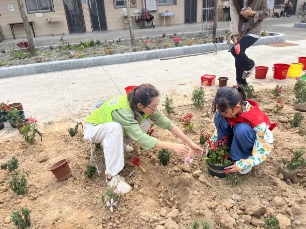 随后,欢乐延续到了户外。连南小学的师生们分组行动,在养老院内的空地上开展了一场别开生面的种花活动。在工作人员的指导和老师的协助下,同学们挥动小铲子,挖坑、扶苗、培土、浇水,每一个步骤都做得认真细致。这片即将焕发生机的土地,不仅种下了花苗,更种下了绿色的希望与跨代际的深厚情谊。
