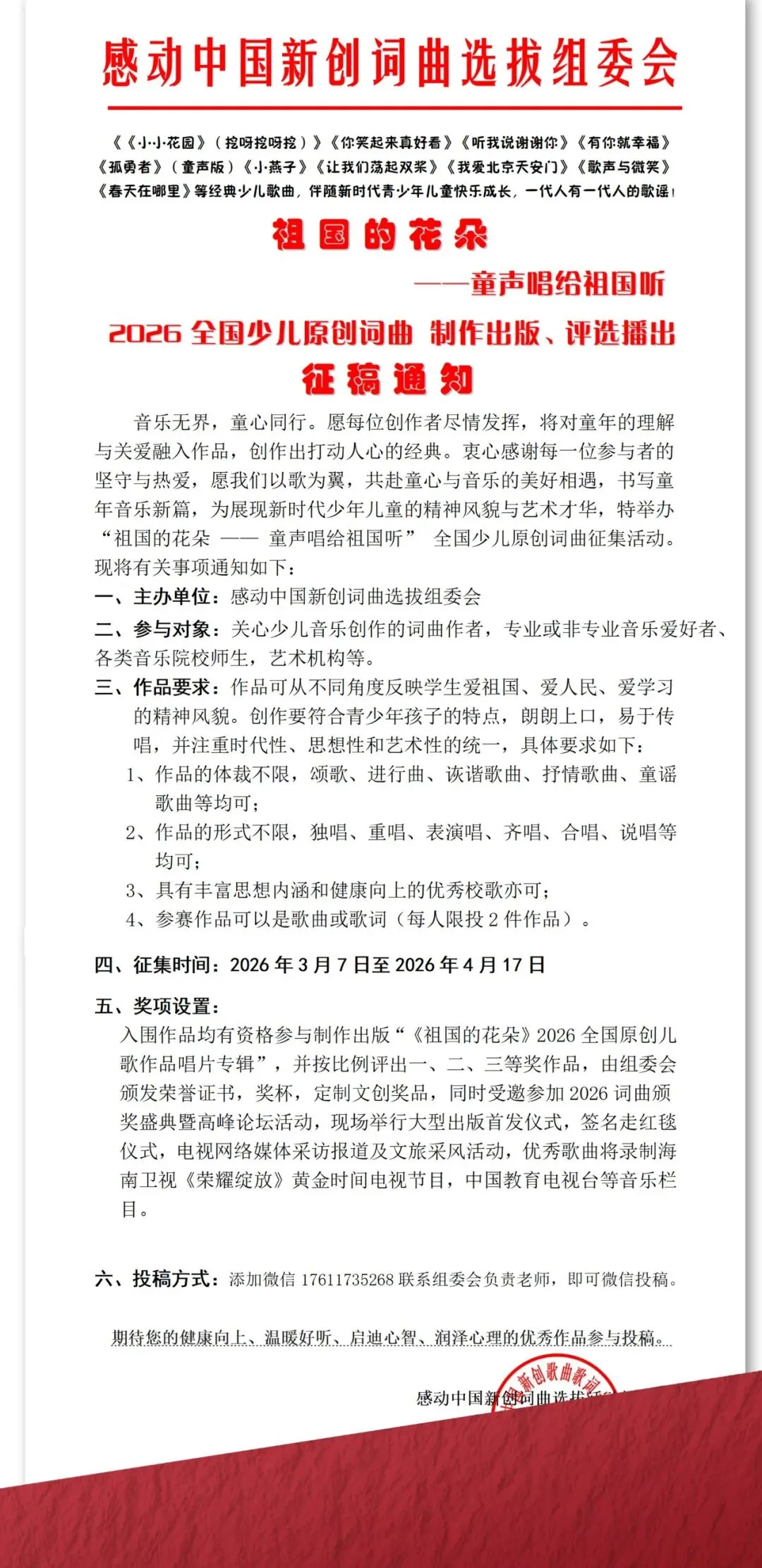 童年的旋律,是藏在时光里最动人的回响;纯粹的歌谣,是滋养童心最温暖的养分。儿歌,承载着孩子们对世界的好奇与热爱,传递着美好、勇敢与善良,是童年不可或缺的精神陪伴,更是连接童心与艺术的桥梁。为发掘优秀原创儿歌词曲人才,丰富儿童文化生活,搭建一个展现创意、传递温情的创作平台,感动中国词曲选拔组委会特举办本次原创儿歌词曲征集活动,邀请您用孩子们的视角,创作兼具思想性与艺术性的儿歌作品。