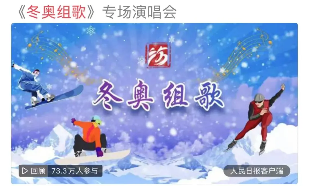 2022年北京冬奥会前夕,北京冬奥和冬残奥组委会文化活动部审批授权,首个冬奥系列组歌《冬奥组歌》作品演唱会重磅上演,央视频、人民日报客户端、国家公共文化云、北京时间等进行了直播。这部由中国V光倾力打造、海淀文旅局主办、海淀文化馆(北部)举办的冬奥活动成功出圈,成为人民参与国家重大活动叙事的新范本,《冬奥组歌》也成为官方认可的文化遗产,诸多作品入选中小学考试试题和大学本科教材。