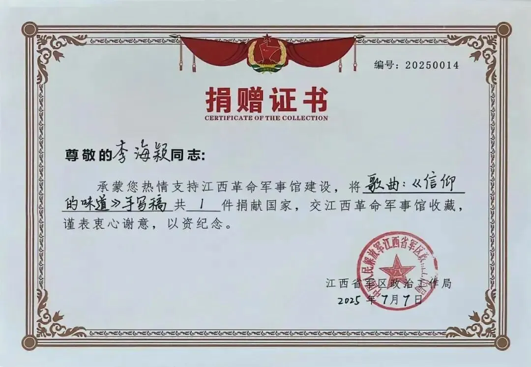 “如果祖国需要,我会随叫随到”这句铿锵有力的呐喊正是出自于作品《利剑出鞘》,曾作为2021年征兵主题歌、2023年东部战区联合利剑演习主题歌,入选中国音协出版的音乐合集,2025年被上海革命军事馆收藏,开辟了“实战演习+文艺创作”的先河。