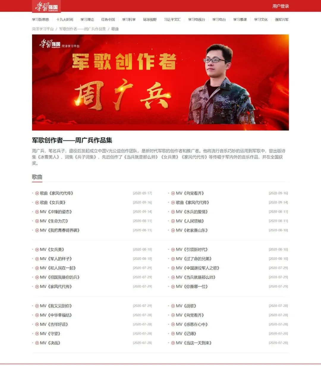 当前文艺的多元化,偏娱乐化,诸多作品呈现出安于现状和个人情绪的表达。中国V光的创作更凸显出集体话语的诠释,强军文艺阵地和强国文化方队成为了其核心。中国V光通过自媒体和联动官方媒体、文艺策划和演出慰问集中发力。由小兵子艺术团领衔强国文艺方队,山东网信办、菏泽宣传部的支持下相继在学习强国、舜网等开设了“小兵子艺术馆”;由中国V光倾力打造强军文艺阵地,开设了“军歌创作者-周广兵作品集”“祖国我是你的兵-兵子作品集”等多部专题。