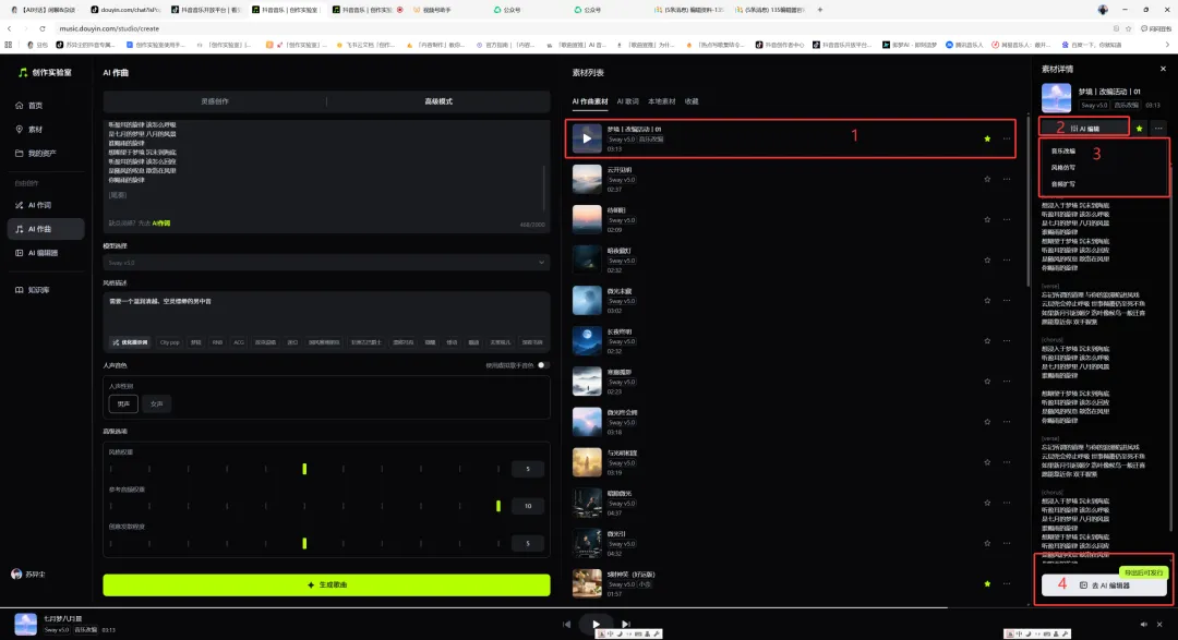 2,获得你喜欢的那首歌曲后可点击页面右下角“去AI编辑器”,进行更多优化、分轨、混响、剪辑调整等。