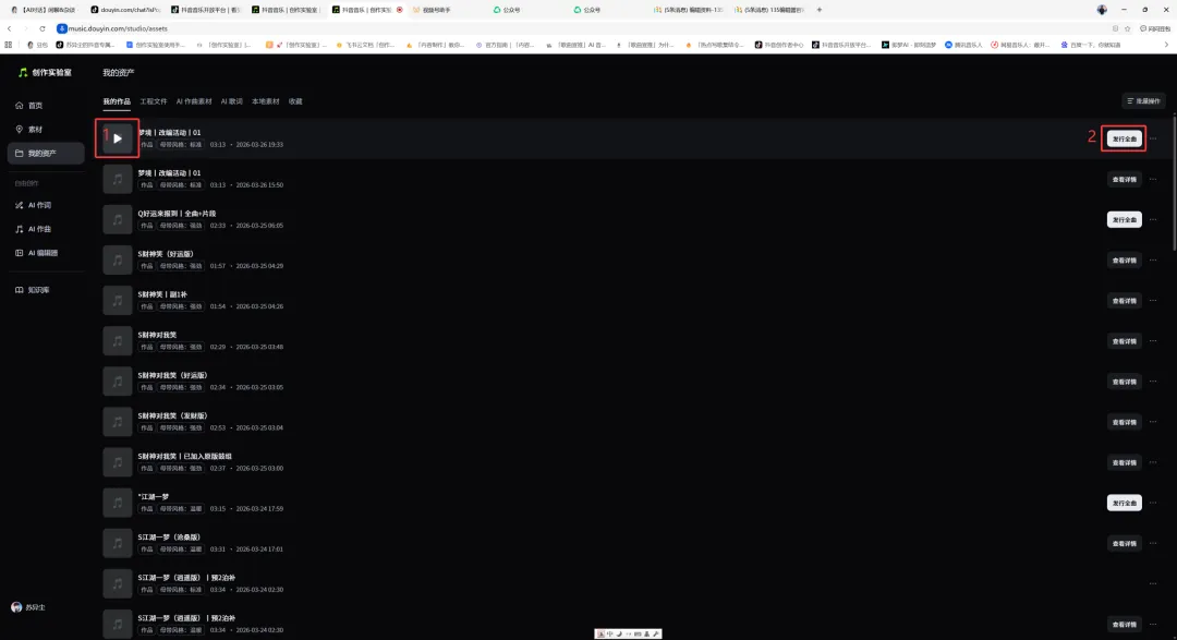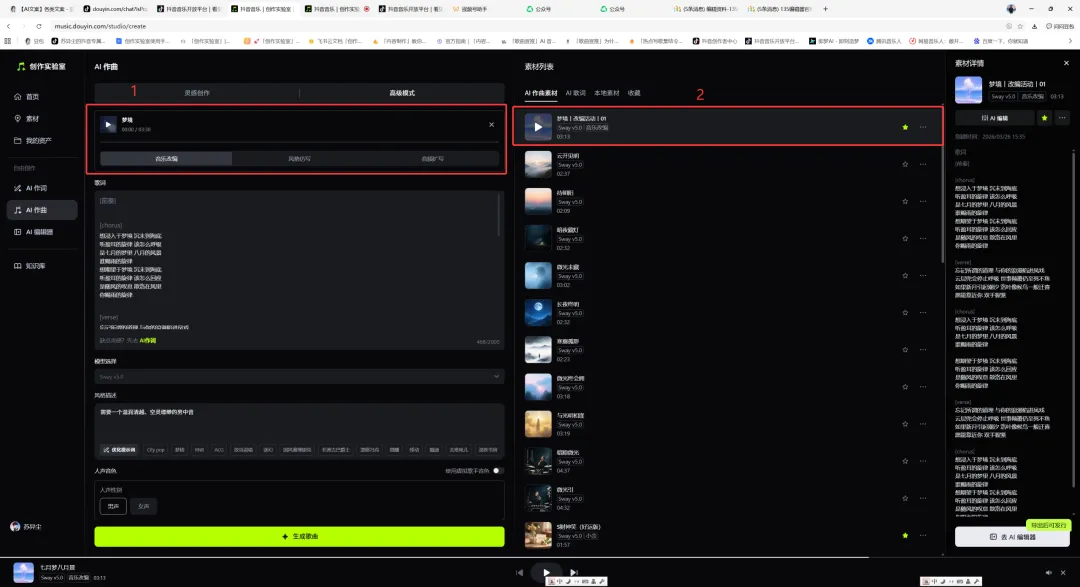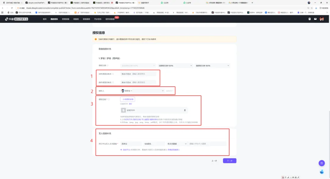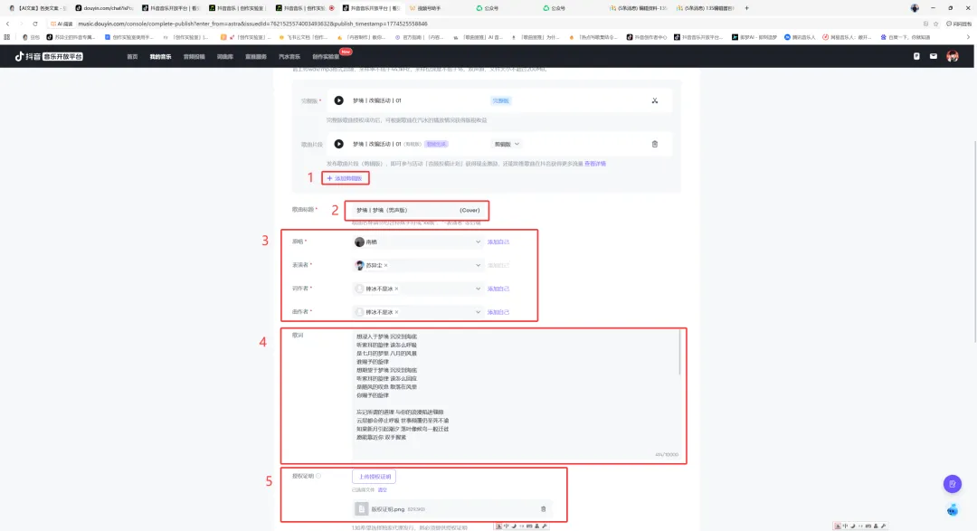 在「创作实验室」AI作曲页面,将1-原歌曲和2-已改编的歌曲,全屏截图即可,将此截图上传至发行页的“授权证明”,见步骤十和步骤十一。