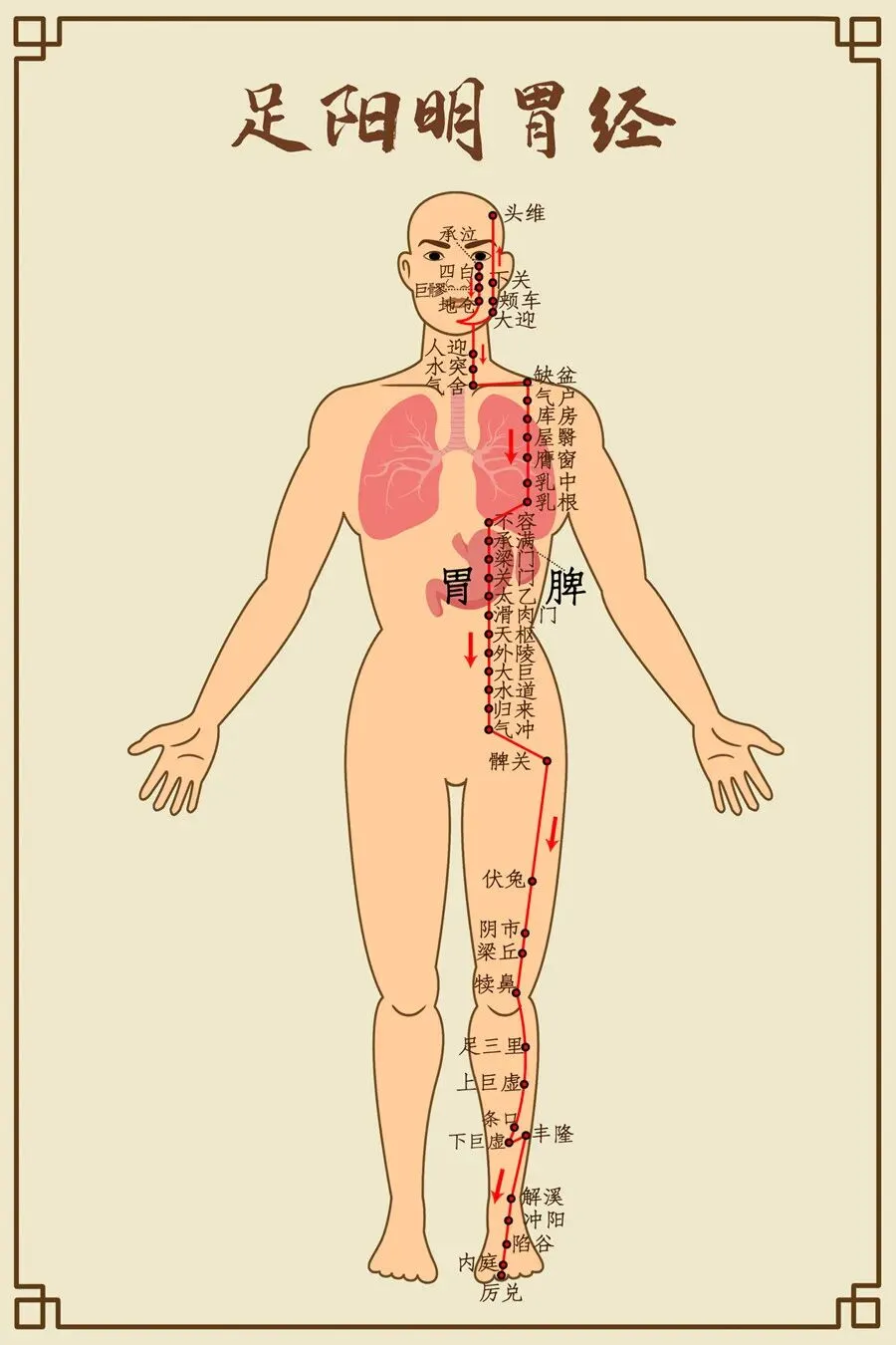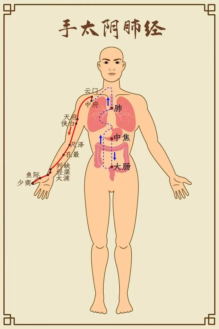 手太阴肺中焦起,下络大肠胃口行,