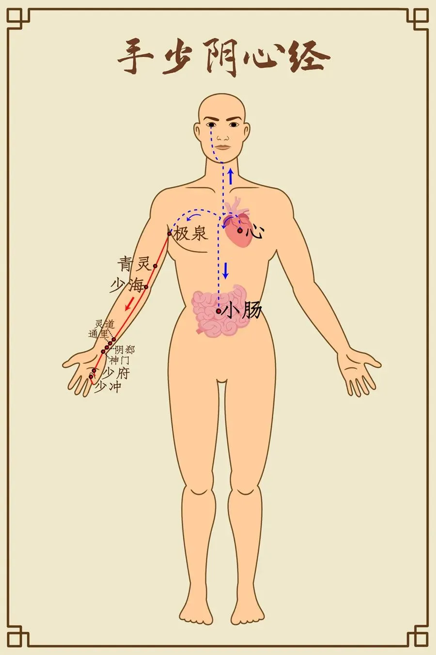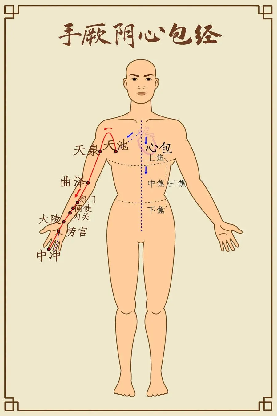 前干心与心包脉,下肘循臂骨上廉,