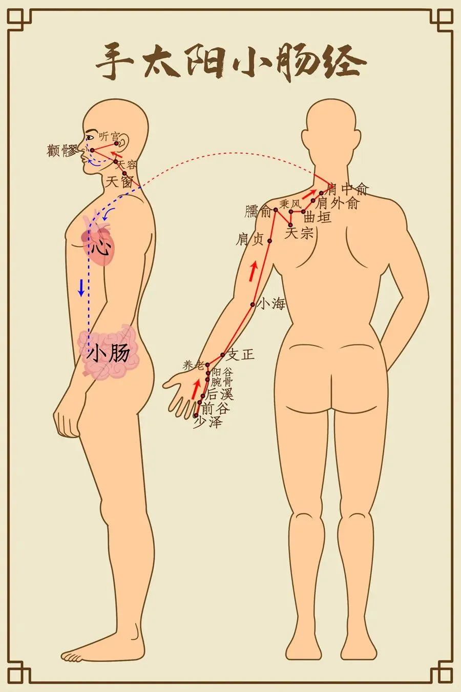 下肘循臂抵掌后,锐骨之端小指停。