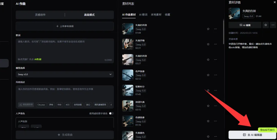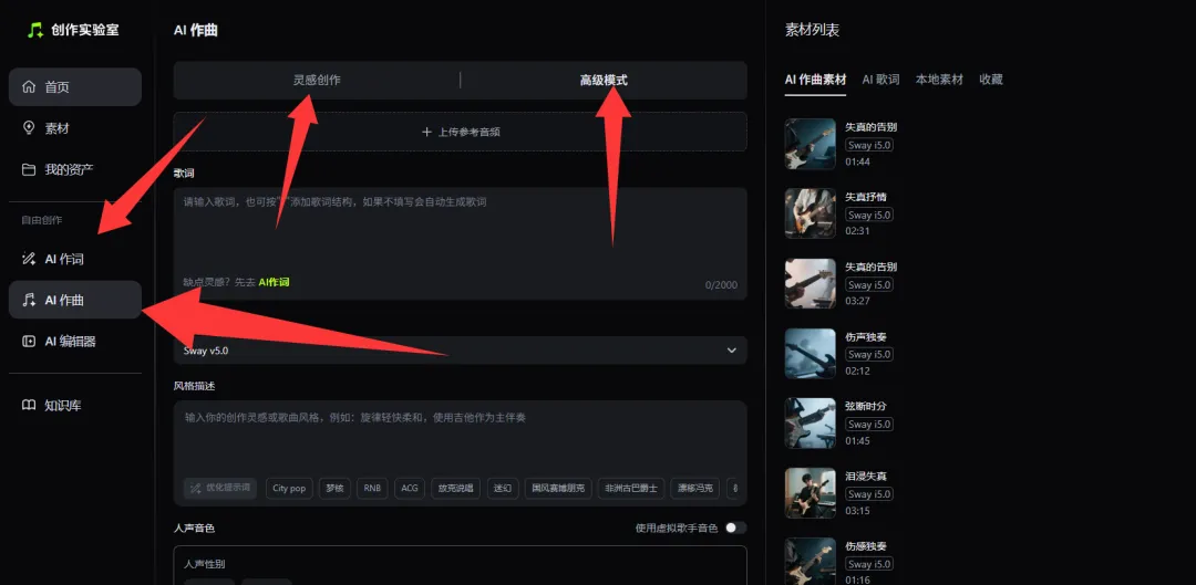 免费生成ai歌曲的平台也有很多:网易的天音ai写歌、抖音音乐的创作实验室、以及被使用最多的suno平台等等都可以。