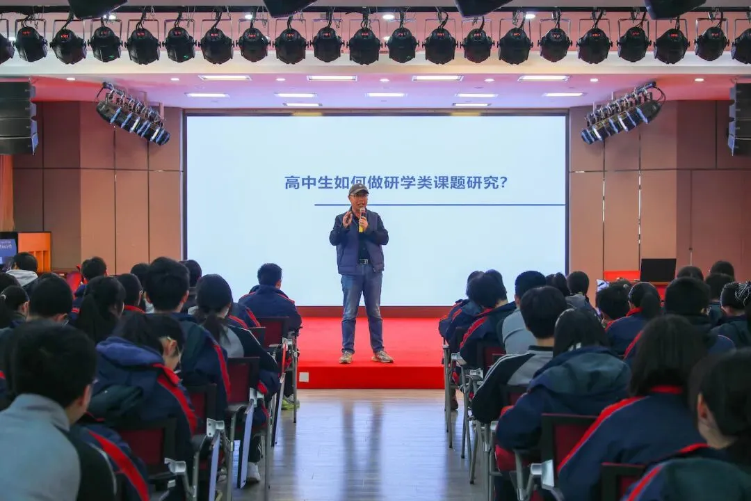 3月13日,学校以一场丰富的课题指导活动拉开南京研学序幕。长宁区教育学院师训主任、正高级教师宋建军做课题研究专业指导讲座,为学生搭建研究框架。他以“高中生如何做科学类课题研究”为主题,结合绍兴、南京研学真实案例,系统阐释选题的价值性、具体性、可行性、趣味性四原则,强调从研学目的地的历史文化、地域特色中挖掘课题创新点。同时,他以课题研究全流程为脉络,指导学生搭建从主题确定到成果展示的完整实施框架,将学术研究规范与研学实践探索紧密结合。
