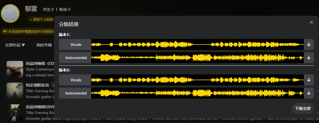 想要更精准地修复唱错的人声片段,还可以使用SUNO提供的人声伴奏分离功能:不仅能对整首歌曲进行人声与伴奏分离,经过局部调整后的音频片段,也可以单独进行人声和伴奏拆分。图中就是分离后的效果,VOCAL代表独立的人声音轨,INSTRUMENTAL 则为纯伴奏轨,我们将它们分别下载保存。
