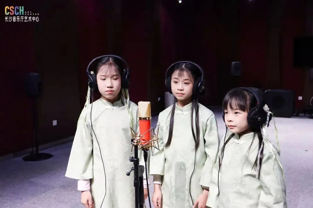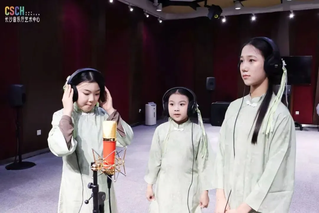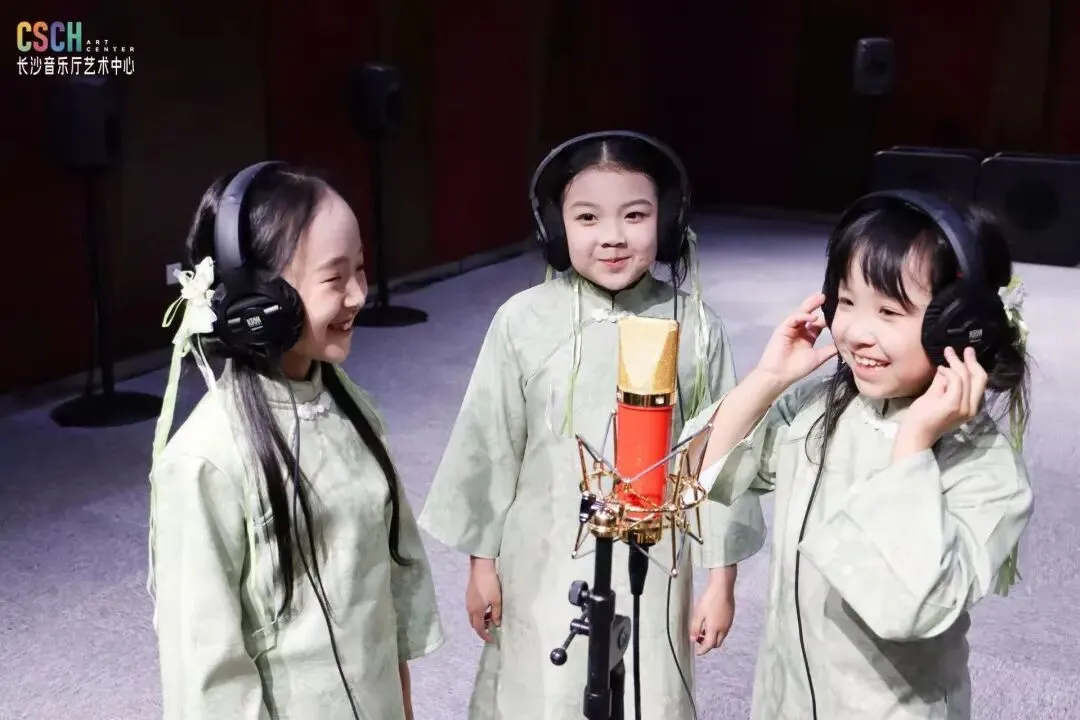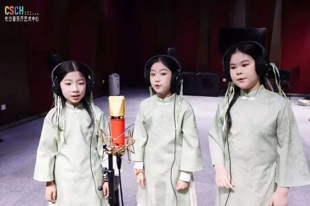 在湘江大厅、麓山中厅、橘洲小厅和音乐厅一号门口,孩子们分组完成了演唱拍摄。面对镜头,她们一开始还有些腼腆,但在老师们的引导下,很快就进入了状态。