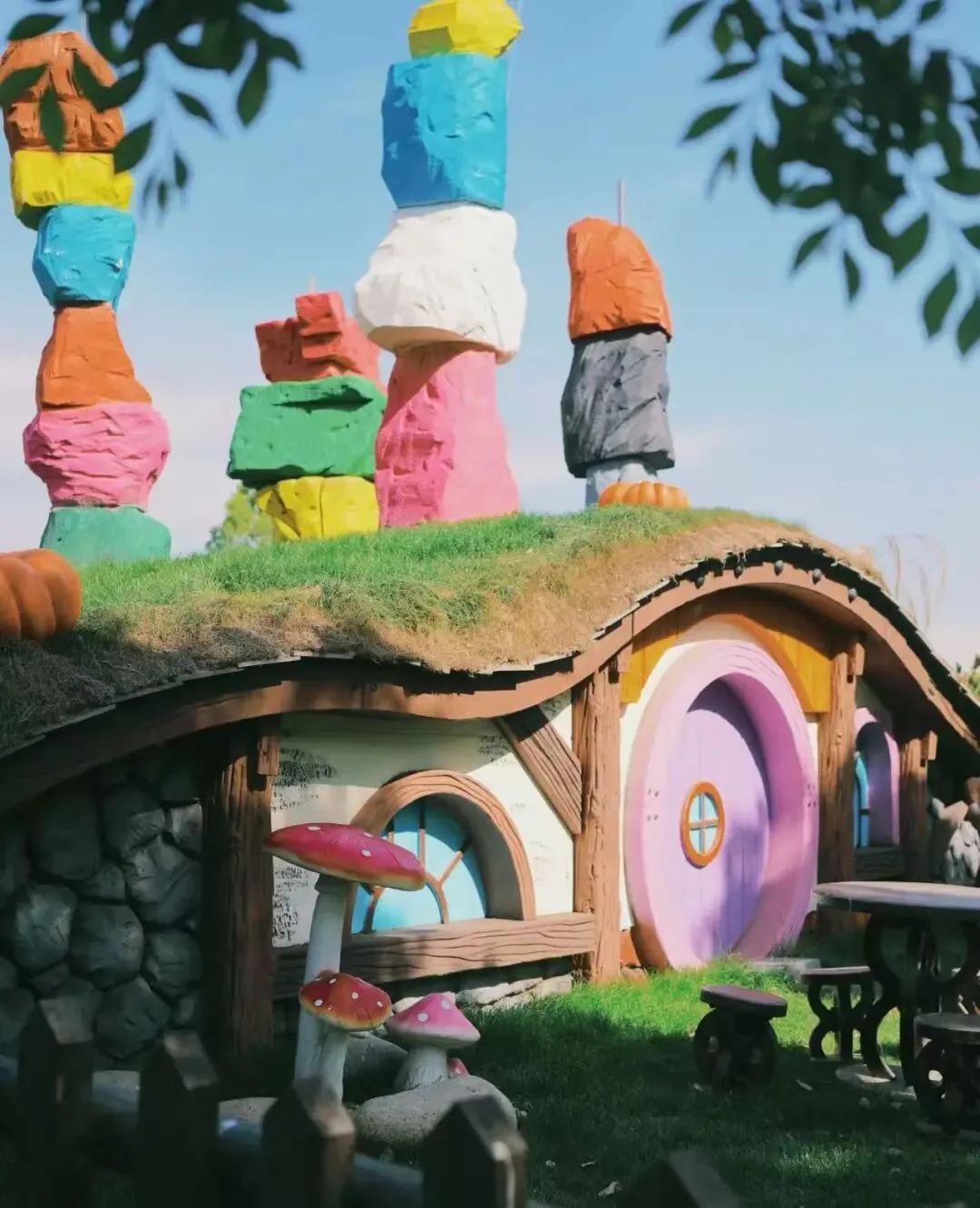 圆润的门窗、低矮的篱笆、藤蔓缠绕的屋顶……每一座洞穴小屋都还原了电影中的田园诗意,随手一拍都是大片!
