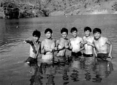 福田公社那时刚刚修建好一个水库,一天演出途中路过那里,但见水库清澈明净波光粼粼,众人大喜过望,纷纷游泳戏水。我心中不免思忖:炳草岗、大渡口、兰尖矿、弄弄坪、河门口等,哪里能寻这等好去处,哪里能享受这等好滋味?于是乎浪里白跳、蛟龙戏水者、狗刨烧者均在水库游得痛快淋漓!适逢水库漂浮一只小船,把它划到湖心,拍照以它为背景,留下这演出途中难得的美好情景!