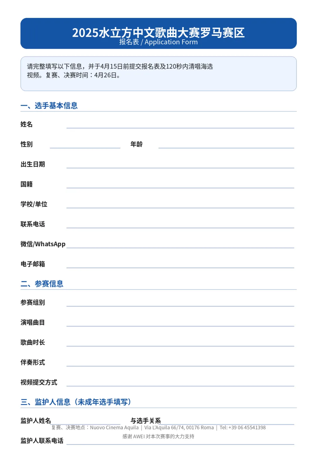 通过海选的选手,将于 4月26日 参加罗马赛区复赛及决赛。