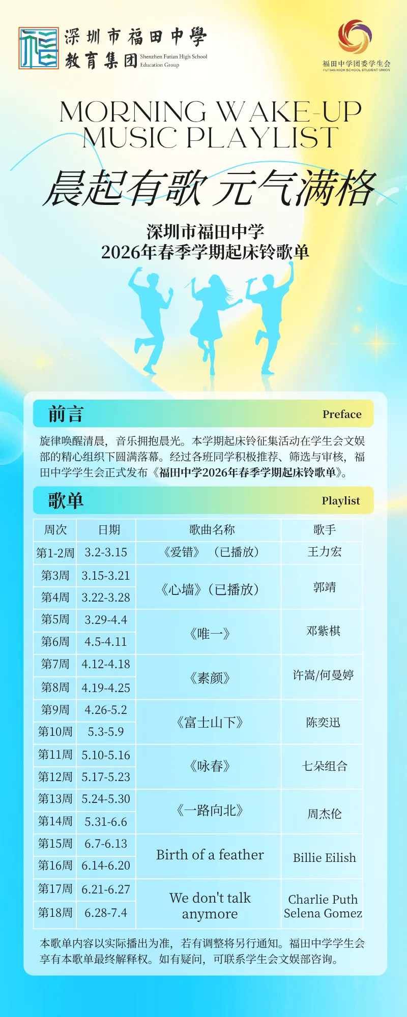 福田中学2026年春季学期起床铃歌单发布