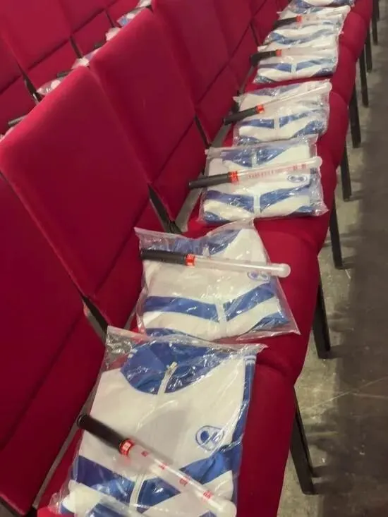 座位上整齐摆放的定制蓝白校服,胸口绣着“时间折叠”