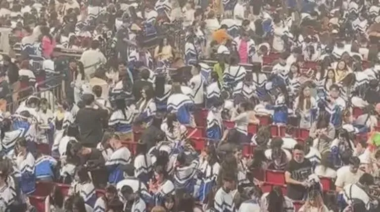 全场统一蓝白校服,大合唱的震撼场面
