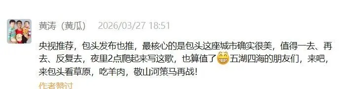在包头发布视频端近期推送的《〈包头也有草原〉获央视舞台推荐》作品中,《包头也有草原》词曲作者黄涛留言道:“央视推荐,包头发布也推,最核心的是包头这座城市确实很美,值得一去、再去、反复去。夜里2点爬起来写这歌,也算值了。五湖四海的朋友们,来吧,来包头看草原,吃羊肉,敬山河策马再战!”