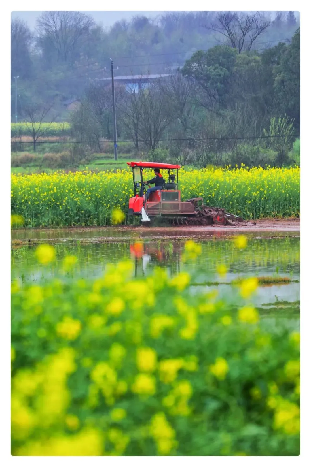 田边上,金黄的油菜花开得正盛,一垄一垄的,像给山坡铺上了金色的毯子。田埂坎上,几树桃花开得热闹,粉粉的、柔柔的,风一吹,花瓣轻轻地飘进水田里,跟着水波一漾一漾的。