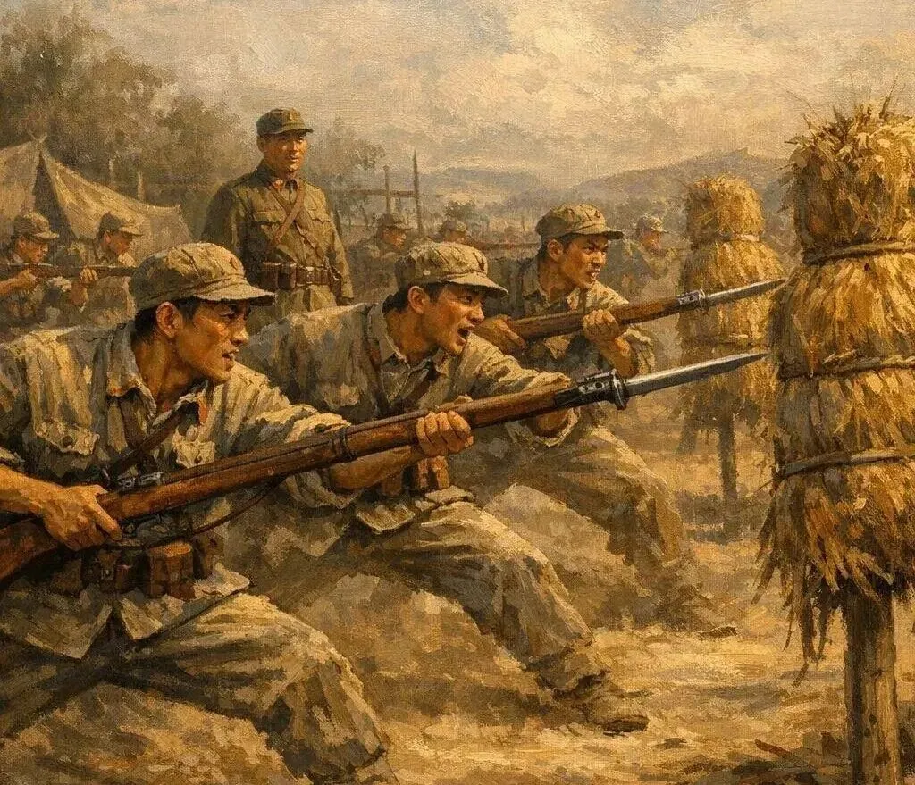大概是在1964年2月1日,《人民日报》发表了“全国人民都学习解放军”的社论,由此,学习解放军在全国全面铺开。学习解放军的活动很快落实的我们的学校生活中,在政治学习时着重领会“四个第一的原则”和解放军的“三八作风”,教室前面黑板上方的标语也换成了“团结、紧张、严肃、活泼”八个字。那时我们住校,不仅早晨出操学习解放军的列队跑步,就是从教室到食堂去吃饭那几步路也要排起队唱着歌齐步走。这些歌当然都是解放军连队里战士们唱的队列歌曲,如《说打就打》、《打靶归来》、《团结就是力量》、《三大纪律八项注意》、《中国人民解放军进行曲》、《新四军军歌》、《八路军军歌》等等,《拼刺刀》也是其中之一。