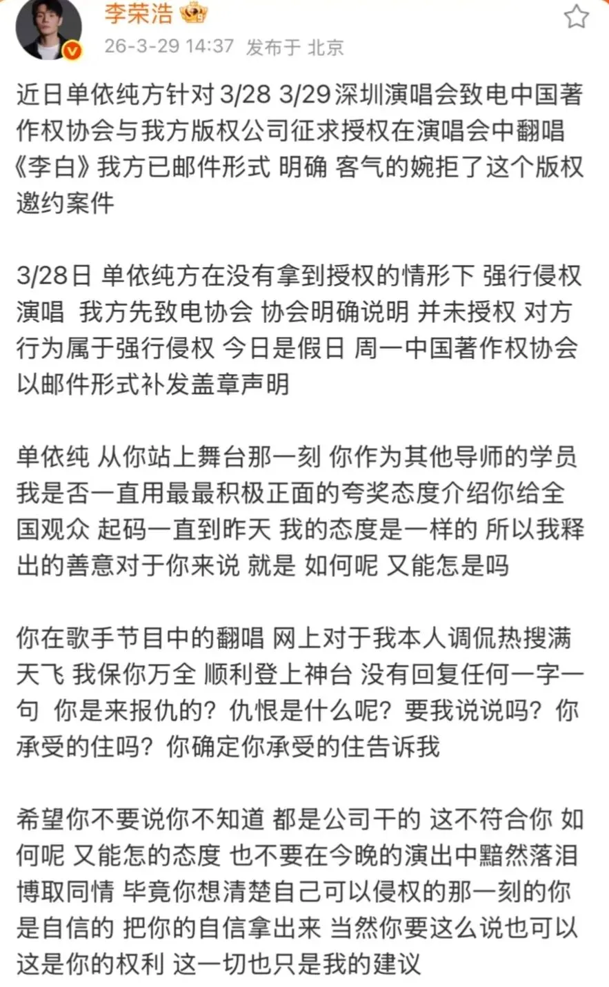 昨天两点多,李荣浩发长文说:单依纯方之前申请过授权,被拒绝了。结果这次演唱会,在没授权的情况下“强行侵权演唱”。