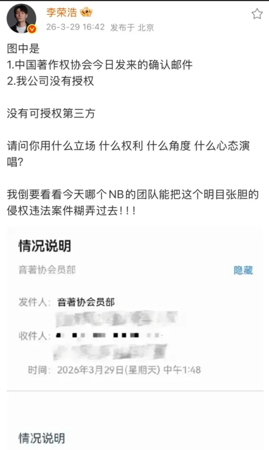 不到半小时,李荣浩又发了一条——中国著作权协会的确认邮件,证明公司没有授权。他连环追问:你用什么立场、什么权利、什么角度、什么心态演唱?并明确说这是明目张胆的侵权违法案件。