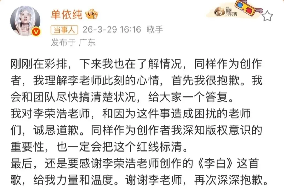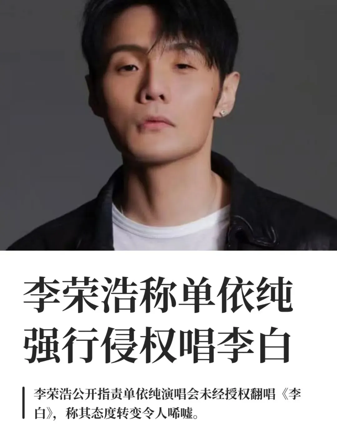 转折点在3月28日。单依纯在自己演唱会上又唱了《李白》。按理说后辈喜欢并演唱前辈的歌是好事,但最抽象的是:这次演唱没拿到版权方授权。更好玩的是,这事儿还是李荣浩自己捅出来的。