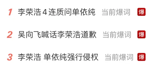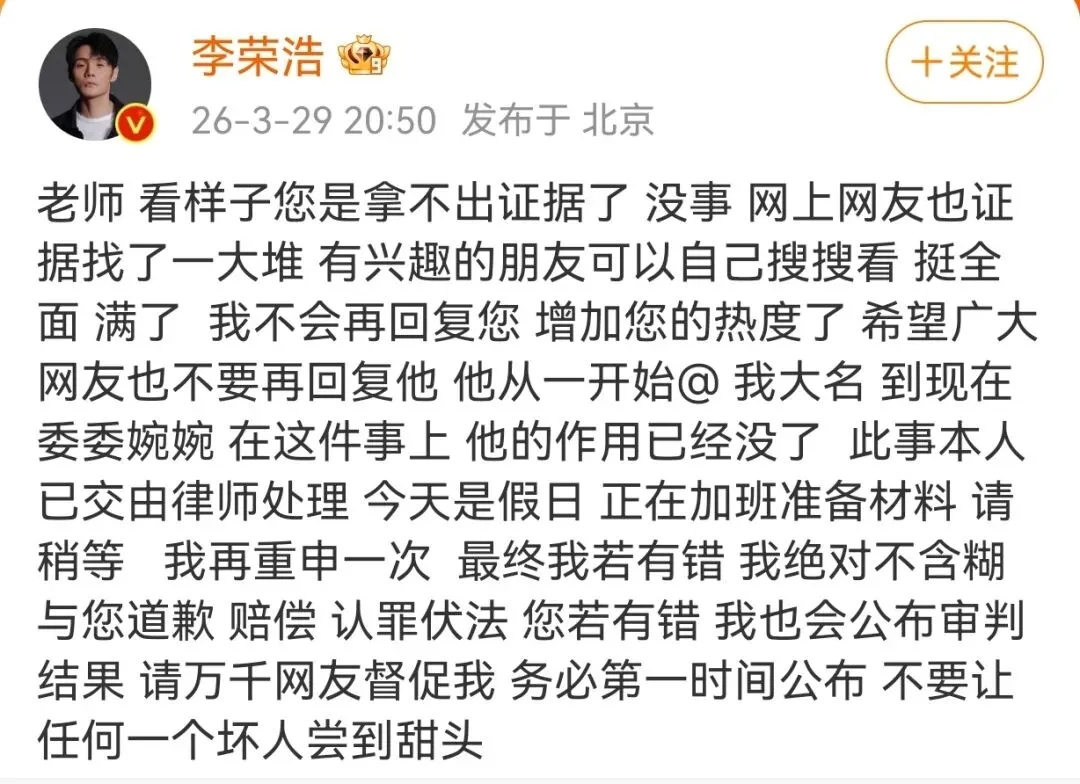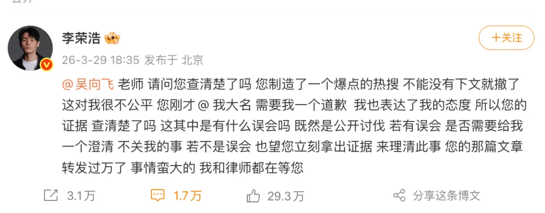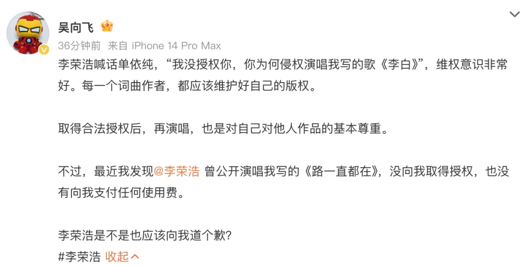 3月29日,李荣浩公开喊话单依纯侵权演唱歌曲《李白》事件持续发酵,多个话题爆上热搜。当天,填词人吴向飞发文称李荣浩曾公开演唱其创作的《路一直都在》,并未取得本人授权,全文如下:李荣浩喊话单依纯,“我没授权你,你为何侵权演唱我写的歌《李白》”,维权意识非常好。每一个词曲作者,都应该维护好自己的版权。取得合法授权后,再演唱,也是对自己对他人作品的基本尊重。不过,最近我发现李荣浩曾公开演唱我写的《路一直都在》,没向我取得授权,也没有向我支付任何使用费。李荣浩是不是也应该向我道个歉?我支持您在网上对我进行质问,麻烦您清楚列明几点,以便大家判断:1.您说的演出是哪年,哪一场 ;2.您说的演出中我是主唱身份的个人演唱会吗?我刚查询了一次,我并未在个人演唱会或音乐节或晚会中唱过这首歌曲,望您明示;3.是否有任何公司事先向您请求授权 ;4.若最终责任人主体是我,我一定公开赔偿,道歉并承认错误,再严重的后果我自愿承担,绝不推辞。随后,李荣浩接着@吴向飞并发文称,“请问您查清楚了吗 您制造了一个爆点的热搜 不能没有下文就撤了 这对我很不公平 您刚才@ 我大名 需要我一个道歉 我也表达了我的态度 所以您的证据 查清楚了吗 这其中是有什么误会吗 既然是公开讨伐 若有误会 是否需要给我一个澄清 不关我的事 若不是误会 也望您立刻拿出证据 来理清此事 您的那篇文章转发过万了 事情蛮大的 我和律师都在等您”。29日晚,李荣浩再次回应: “老师 看样子您是拿不出证据了 没事 网上网友也证据找了一大堆 有兴趣的朋友可以自己搜搜看 挺全面 满了 我不会再回复您 增加您的热度了 希望广大网友也不要再回复他 他从一开始@ 我大名 到现在委委婉婉 在这件事上 他的作用已经没了 此事本人已交由律师处理 今天是假日 正在加班准备材料 请稍等 我再重申一次 最终我若有错 我绝对不含糊与您道歉 赔偿 认罪伏法 您若有错 我也会公布审判结果 请万千网友督促我 务必第一时间公布 不要让任何一个坏人尝到甜头”
