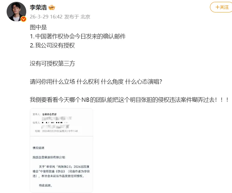 李荣浩再发著作权协会情况说明,控诉单依纯:请问你用什么立场?什么权利?什么角度?什么心态演唱?详见此前报道:李荣浩回应单依纯道歉