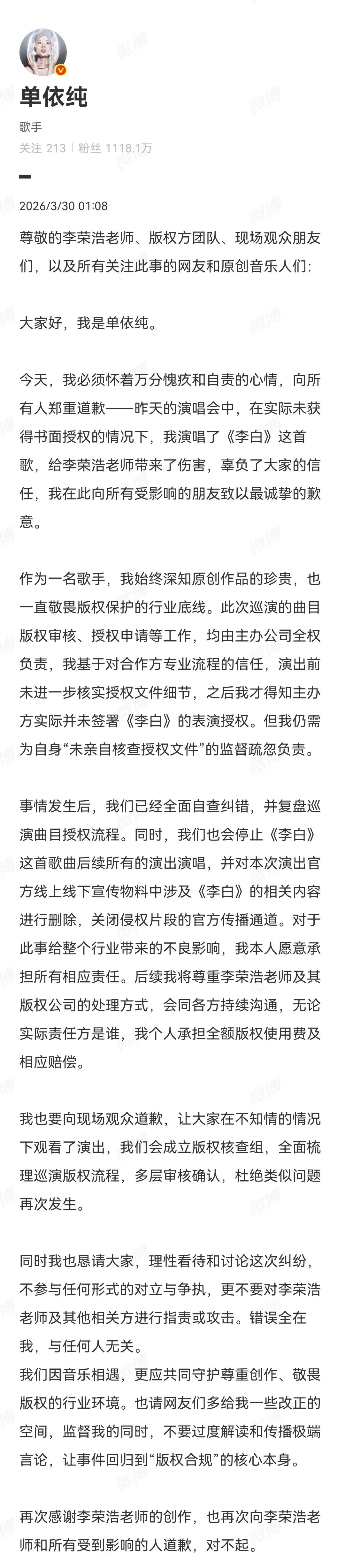 3月29日李荣浩发文控诉单依纯深圳演唱会在没有拿到授权的情形下,强行侵权演唱《李白》这首歌曲。